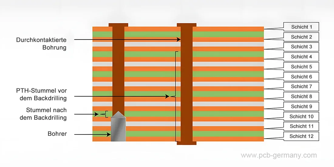 Rückbohren ist ein Verfahren, das bei der Herstellung von mehrschichtigen Leiterplatten angewendet wird, um die ungenutzten Teile der Durchgangslöcher (sogenannte Via-Stubs) aus den inneren Schichten zu entfernen. Diese Stubs sind verbleibende Teile von durchkontaktierten Löchern, die die Signalübertragung durch Reflexionen unterbrechen und die Signalintegrität beeinträchtigen können. Durch das Ausbohren dieser unerwünschten Teile dient das Backdrilling dazu, die Impedanzkonsistenz aufrechtzuerhalten und Signalverzerrungen zu verringern. Diese Technologie ist besonders nützlich bei Hochgeschwindigkeits-Leiterplattenkonstruktionen, bei denen saubere Signalwege unerlässlich sind.